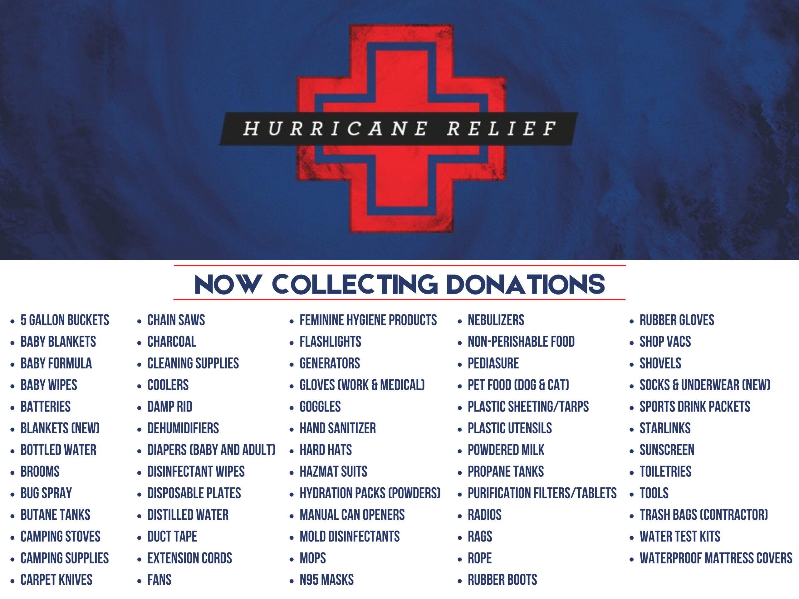 You have most likely seen the devastation across the southern states with the recent hurricanes and flooding. We have the opportunity to be a blessing financially, and also help with gathering and donating items toward disaster relief. There are churches on the ground in North Carolina who are distributing the goods, and there are people in place to bring the items we collect down to those churches.